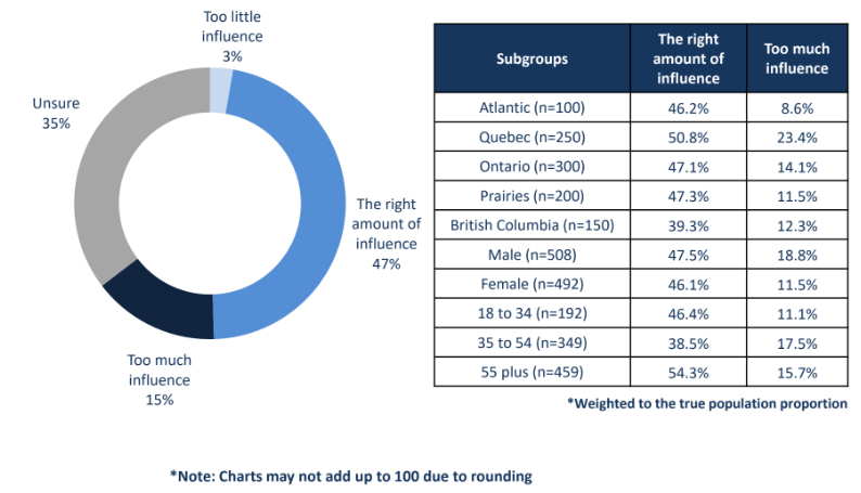 Canadians most often believe that Jewish people in Canada hold the right amount of influence in the business world, but nearly one in six say they hold too much influence – When asked what level of influence Jewish people in Canada hold in the business world, nearly half of Canadians say the right amount of influence (47%), fifteen per cent say too much influence and three per cent say too little influence. Thirty-five per cent are unsure.