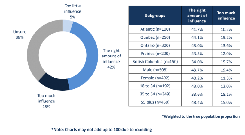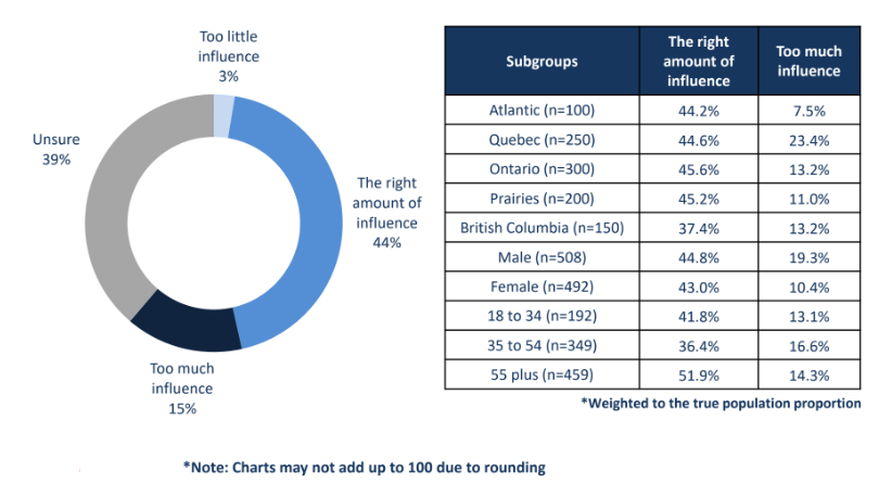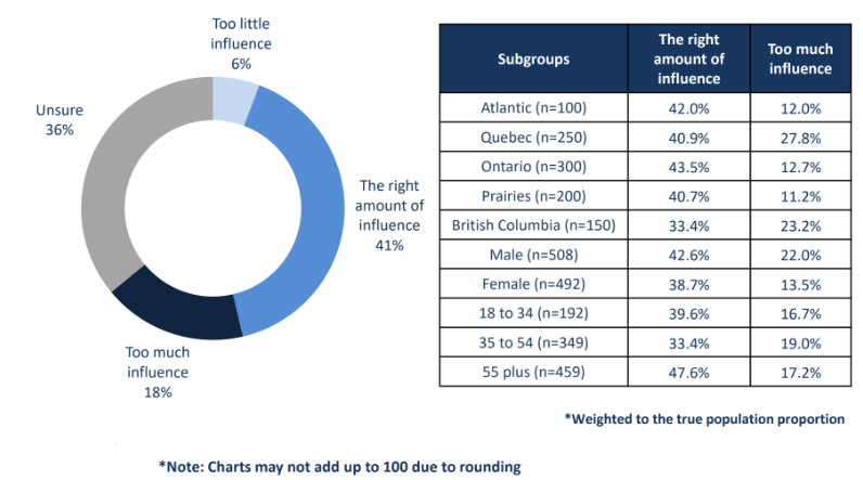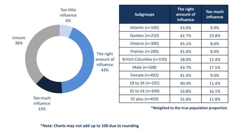Finding 2. Overall, Canadians most often think that Jewish people in Canada have the right amount of influence in Canada, but nearly one in six Canadians express views that could be anti-Semitic.