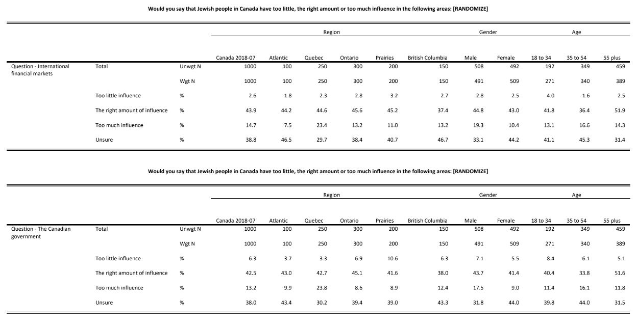 QUESTION – Would you say that Jewish people in Canada have too little, the right amount or too much influence in the following areas: International financial markets