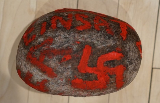In January 2017, a family arrived at their Winnipeg home to find a red gift bag with a large rock wrapped in a ribbon inside. On the ribbon were the words, “Jude bitch get out of the neighbourhood.” According to CBC News, when the family took the ribbon off, they found the rock was painted with a swastika and another word, “Die Jew bitch” and “Einsatzgruppen” referencing the Nazi death squads.