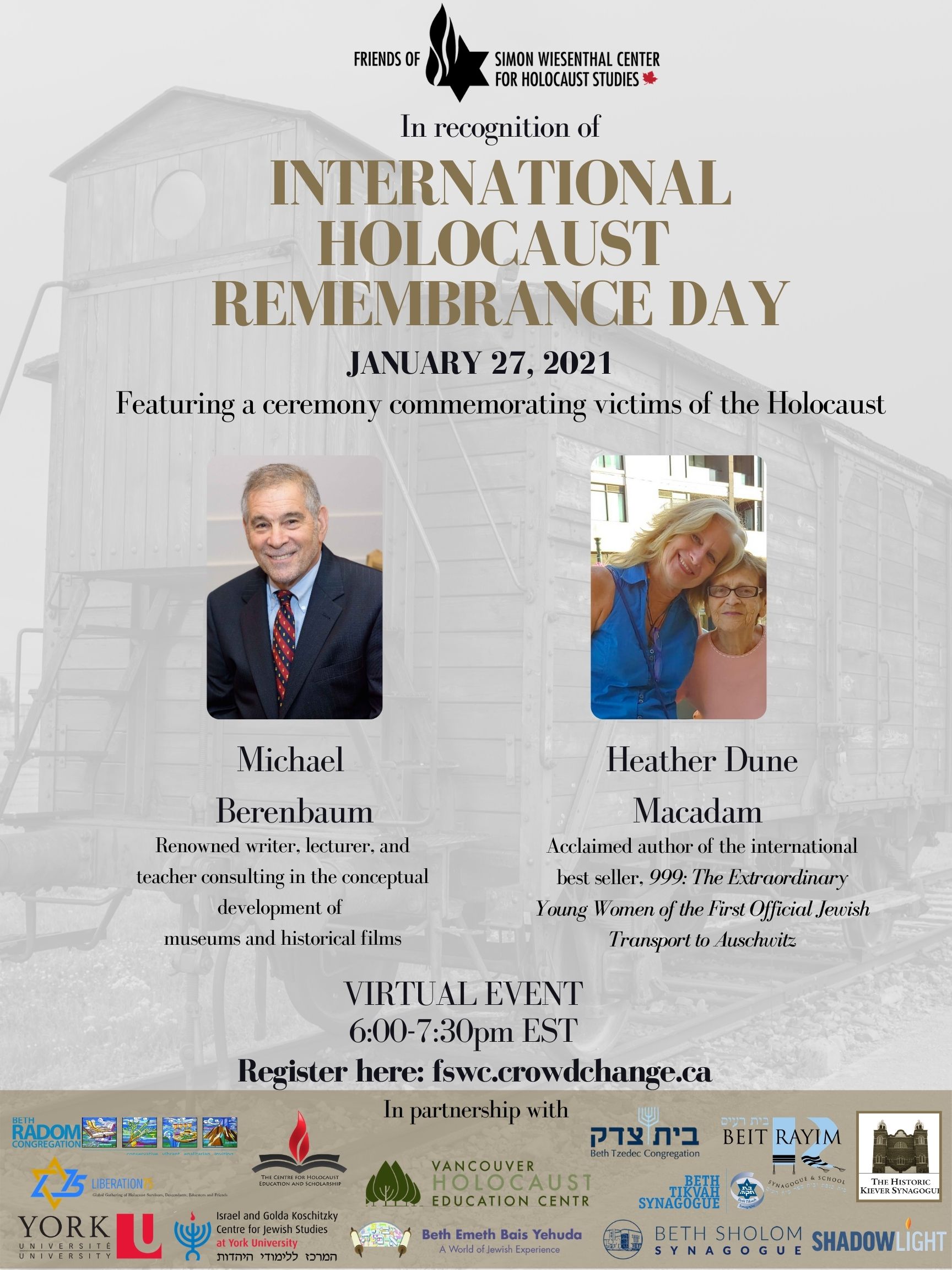 Due to the COVID-19 pandemic, Friends of Simon Wiesenthal Center for Holocaust Studies will not be hosting a National Conference on Holocaust Education this year. However, we are thrilled to be partnering with a number of organizations to present a special virtual program in recognition of International Holocaust Remembrance Day on January 27th, 2021. We hope that you will be able to join us.