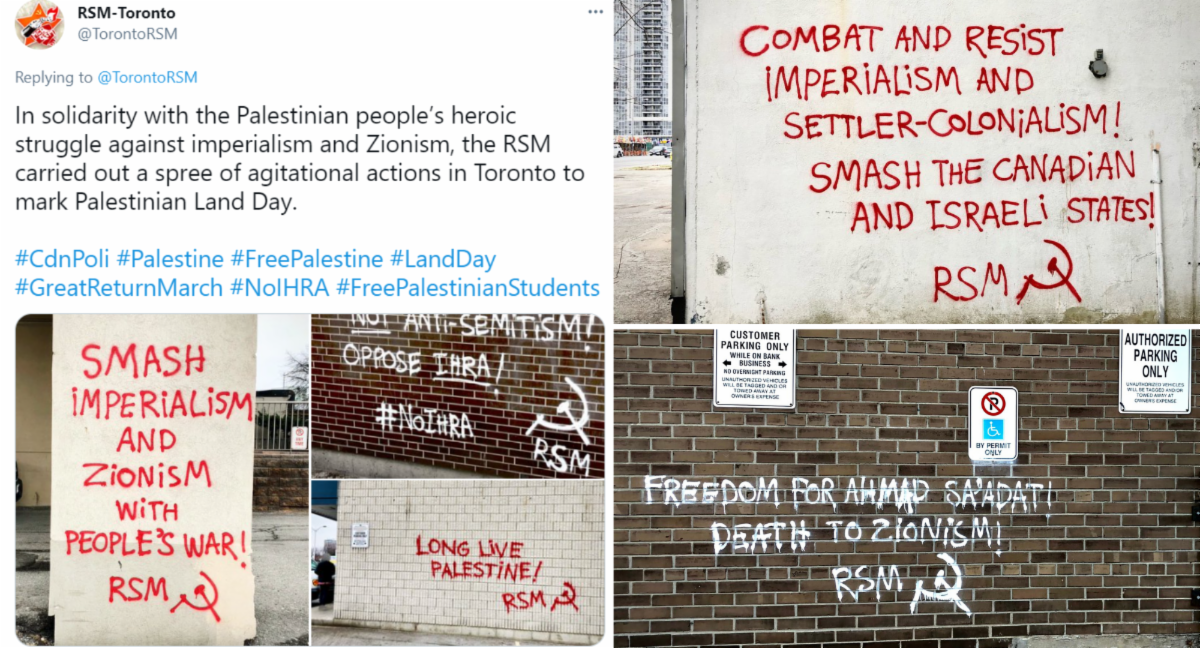 On Twitter, numerous posts by the Greater Toronto Area section of the group reveal a series of graffiti attacks committed over the past week, some of which glorified and suggested violence. Statements included "Smash imperialism and Zionism with people's war!" and "Death to Zionism", among many others.